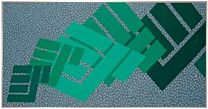 Akryylimaalaus neljän taulun sarjasta Muovitehdas Europakin asiakastiloihin 1995