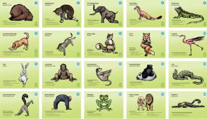 H.O.K.: Ketterät kaverit -joogakorttisarjan kuvitusta. Nurmijärven liikuntatoimi 2018